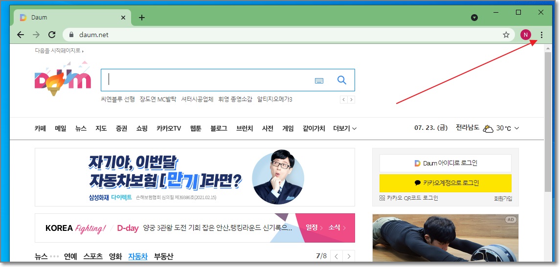 크롬으로 다음을 접속한 다음 오른쪽 위쪽에 있는 점 세 개를 누릅니다.