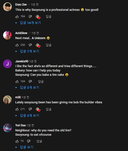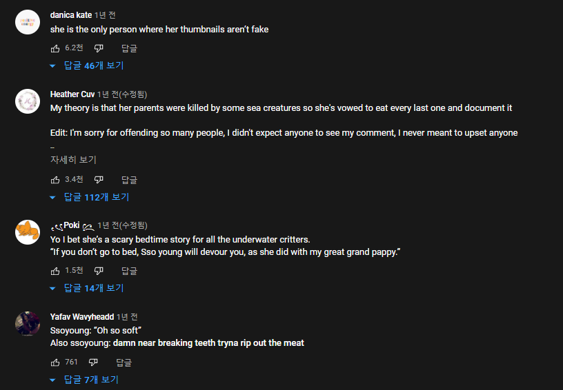 댓글창을 보면 주로 외국인들의 댓글이 많은 만큼 외국인들에게 작은 동양 여자가 큼직한 음식을 먹는 모습이 독특해서 좋아하는 것 같습니다.