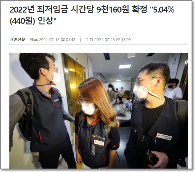 최저임금위원회에서는 결정된 내년 최저임금안을 고용노동부 장관에게 제출한 후 재심의 요청 등 이의제기를 통해 올해 8월 5일에 최종 최저임금이 고시됩니다. 재심의는 노사양측 모두 가능하고 고용노동부 장관이 합당한 이의제기라고 인정할 경우 재심의가 요청되는데요. 큰 이변이 없는 한 2022년의 최저임금은 9160으로 확정될 예정입니다.