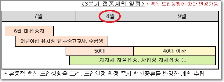 정부는 앞서 18~49세의 접종 시작이 50대 접종이 끝나는 8월25일 이후가 아니라 그 전이라도 중첩된 기간이 있을 수 있다고 밝힌 바 있습니다만 구체적인 일정은 화이자 백신 도입 계획에 따라서 달라질 예정입니다.