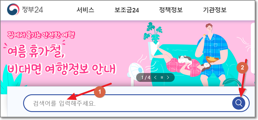 지금까지 정부24 홈페이지에서 보이는 대표적인 메뉴에 대해서 알아보았는데요. 홈페이지에서 길을 잃고 무엇을 어디에서 찾아야 할지 모르신다면 정부24 홈페이지 가운데 있는 검색창에 필요한 검색어를 입력하고 오른쪽에 있는 돋보기를 누르면 원하는 민원을 쉽게 검색할 수 있습니다.