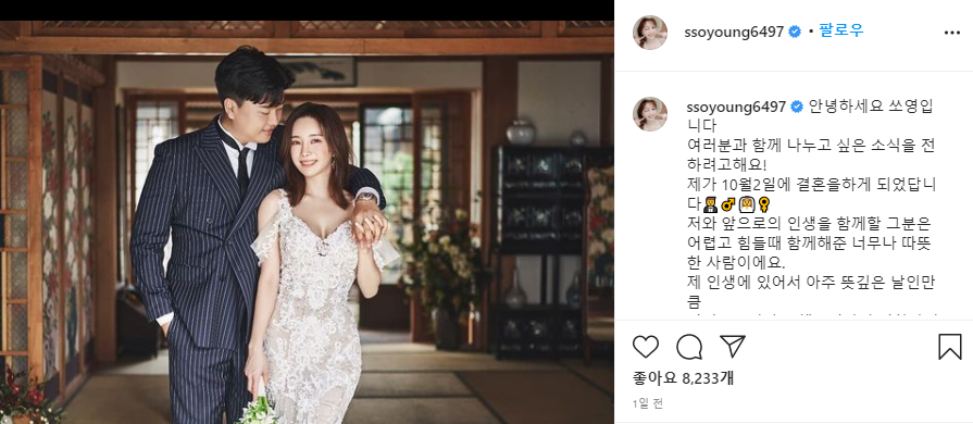 Hello everyone, I'm Ssoyoung! I have an announcement I want to share with all of you! I'm getting married on this October 2nd🤵♂️👰♀!! A person who will be with me for the rest of my life, is such a warm person who has been always there for me in difficult times for many years. It's going to be a even better day significant day if you guys all bless me together. In the future, I will live by giving and sharing lots of love with others since I got so much love from all of you. I would be grateful if you bless two of us, so that we can be happy❤ I will also wish all of you guys be happy all the time!