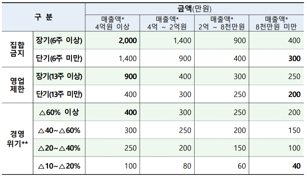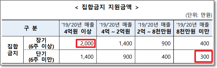 👉 집합 금지 이행기간, 매출 규모에 따라 300만 원 ~ 2000만 원 지원