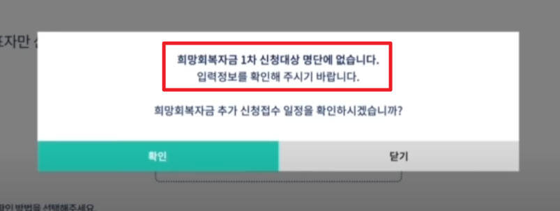 만약 아래처럼 "대상자 명단에 없다"라고 나오면 혹시 신청 정보가 잘못되었는지 확인해보고 그래도 마찬가지라면 9월 말에 예정된 확인 지급 시 다시 신청해주시기 바랍니다.