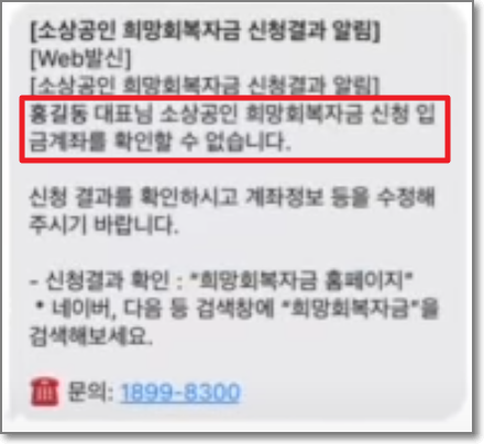 만약 신청자와 계좌 예금주 정보가 다른 사람일 경우 아래와 같이 정상적으로 신청이 되지 않았다는 문자가 오게 됩니다.