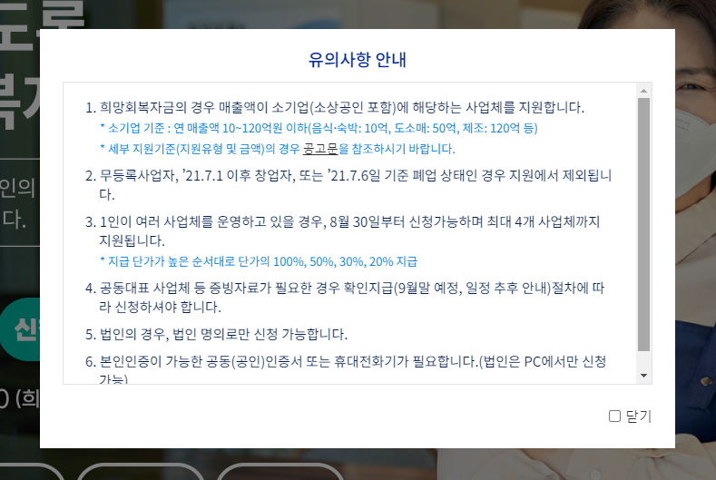 매출액이 소기업(소상공인 포함)에 해당하여야 하며 개업일이 사업자등록증상 2021년 6월 30일 이전이고 동년 7월 6일 기준 폐업상태가 아니어야 합니다. (휴업은 가능, 단 7월6일 폐업상태가 아니었더라도 그 이후에 폐업지원금을 받은 경우에는 이번 지원 대상에서 제외됩니다.)