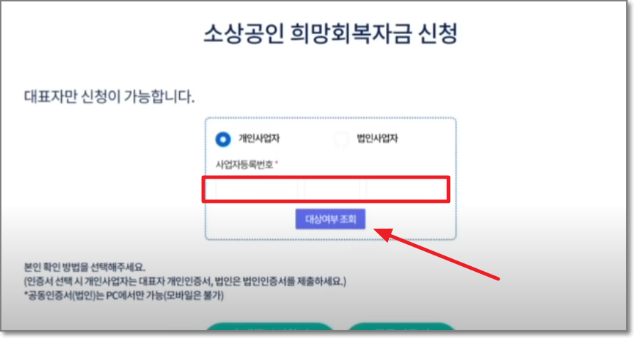 모두 동의를 누르고 "확인"하셨으며 아래처럼 사업자 등록번호를 입력하고 대상 여부를 조회합니다.